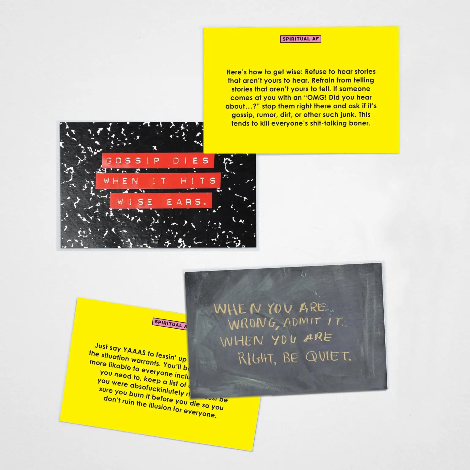 These super-salty, ultra-inspiring cards don’t sugarcoat that it’s often hard AF to grow as a human and be your best self. Use this deck to help you put feet on your spiritual practice. Simply pick a card, read it, do what it says, then see your life get less shitty. It’s spiritual growth in a box!
