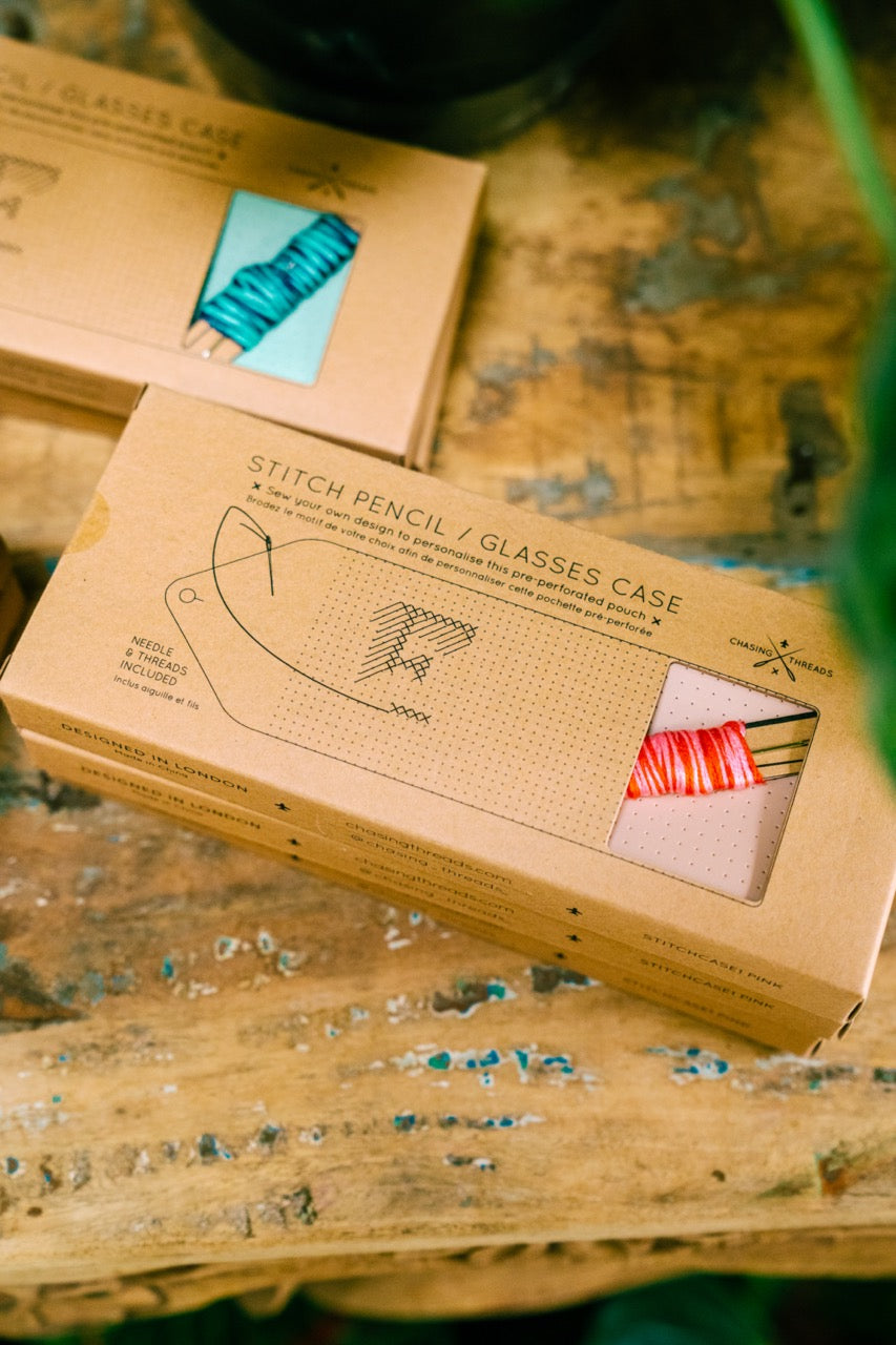 - The pink pouch comes with pink & red thread & needle wrapped on our pen thread-board.