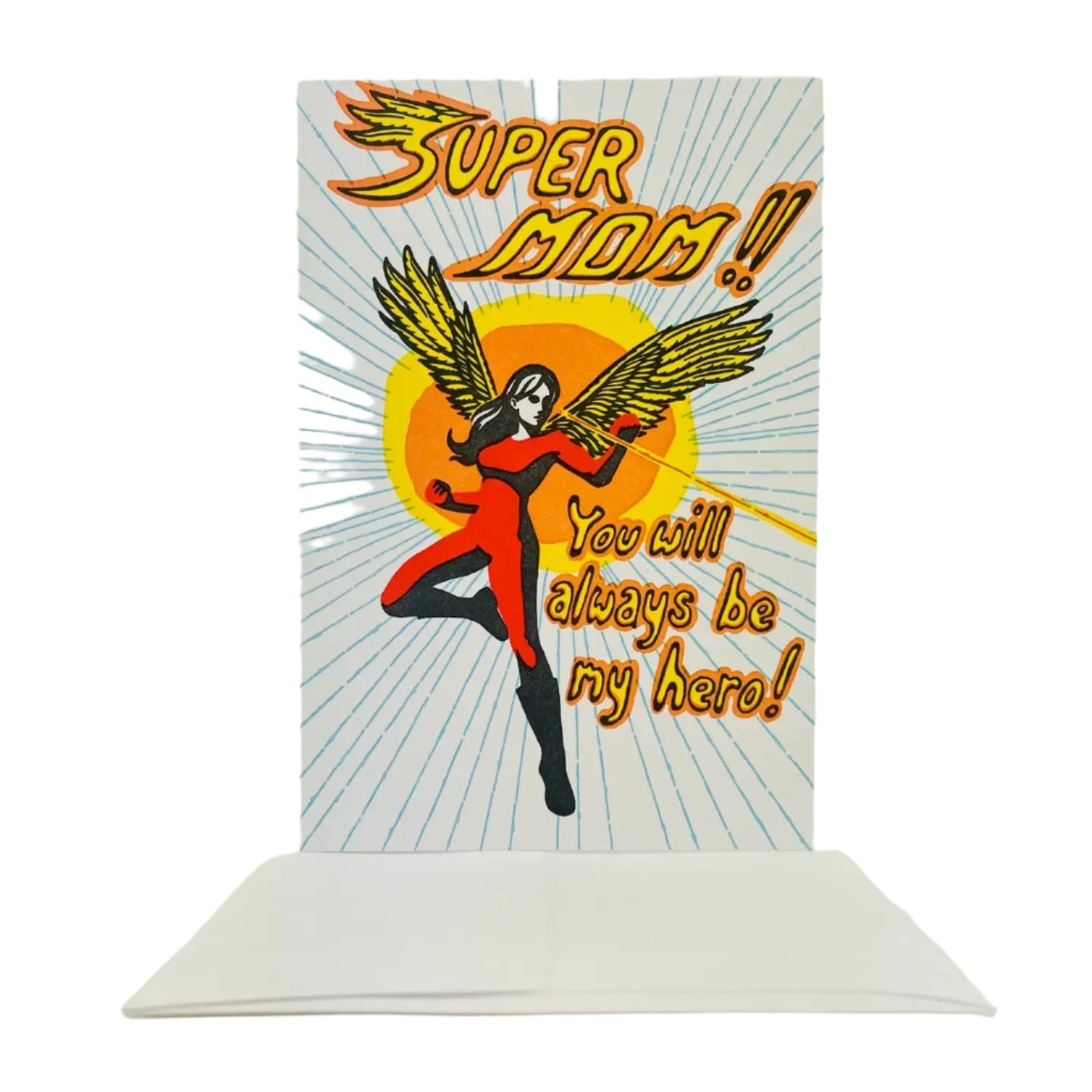 This mom is a super hero with angel wings and laser vision! A cute nod to retro comic book heroes of the 70s. A card for the cool mom who is awesome and not to be trifled with! Letterpressed in multiple overlapping colors. Blank inside for your own message. 6 1/4"x4 1/4" card with matching standard A6 square flap envelope. Card comes in a #5 recyclable open flap clear sleeve.