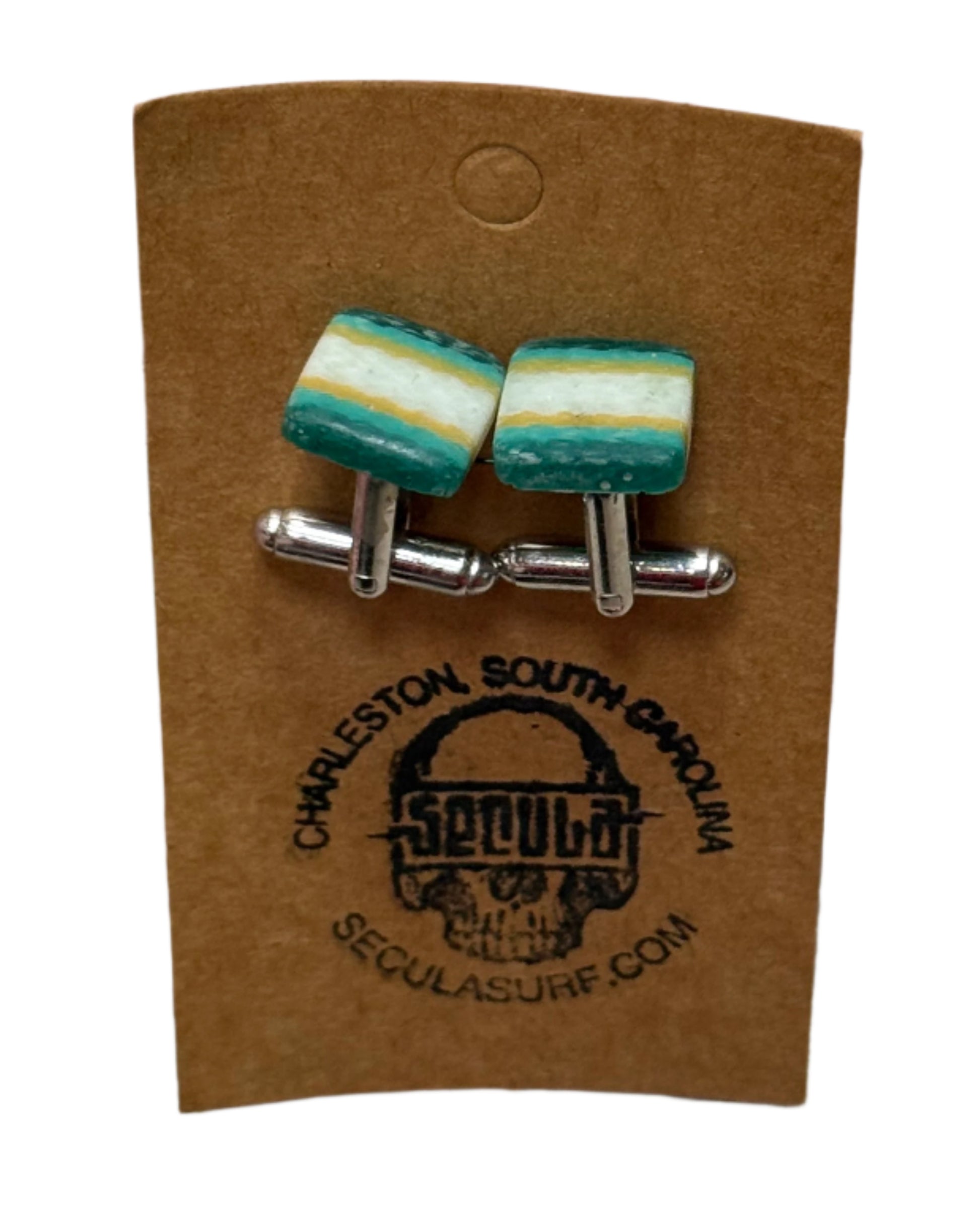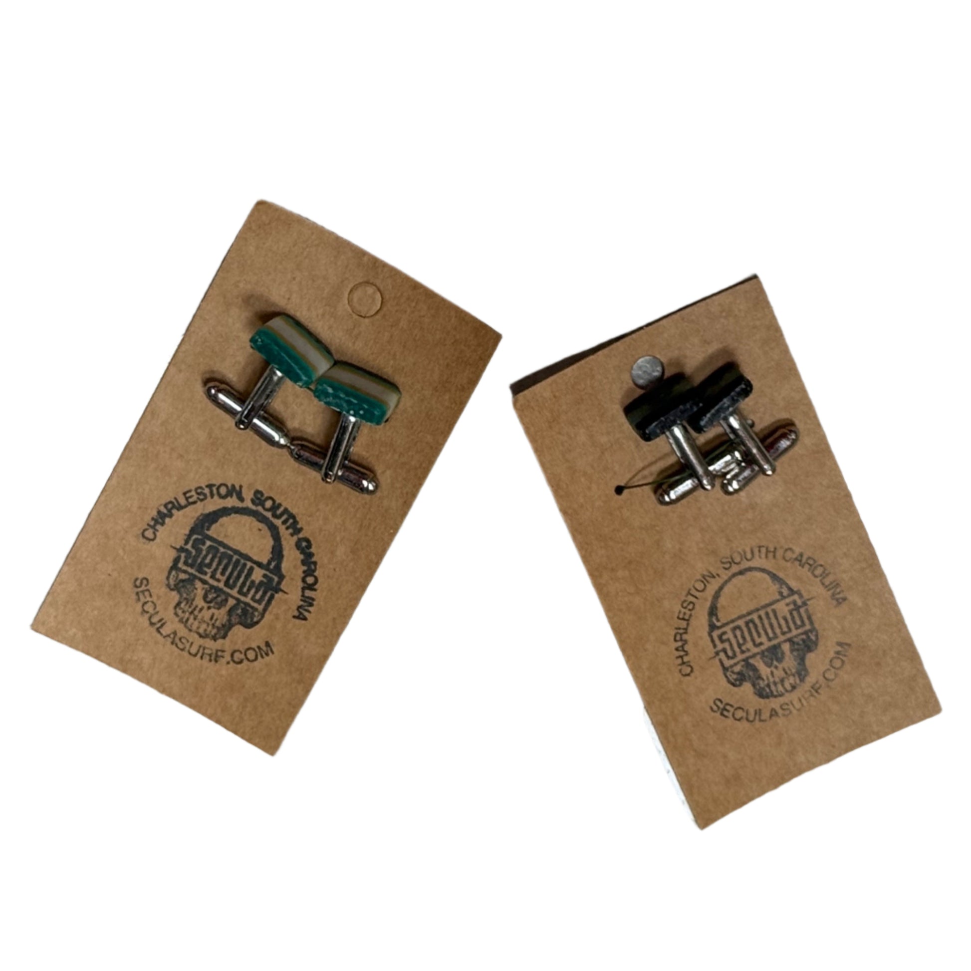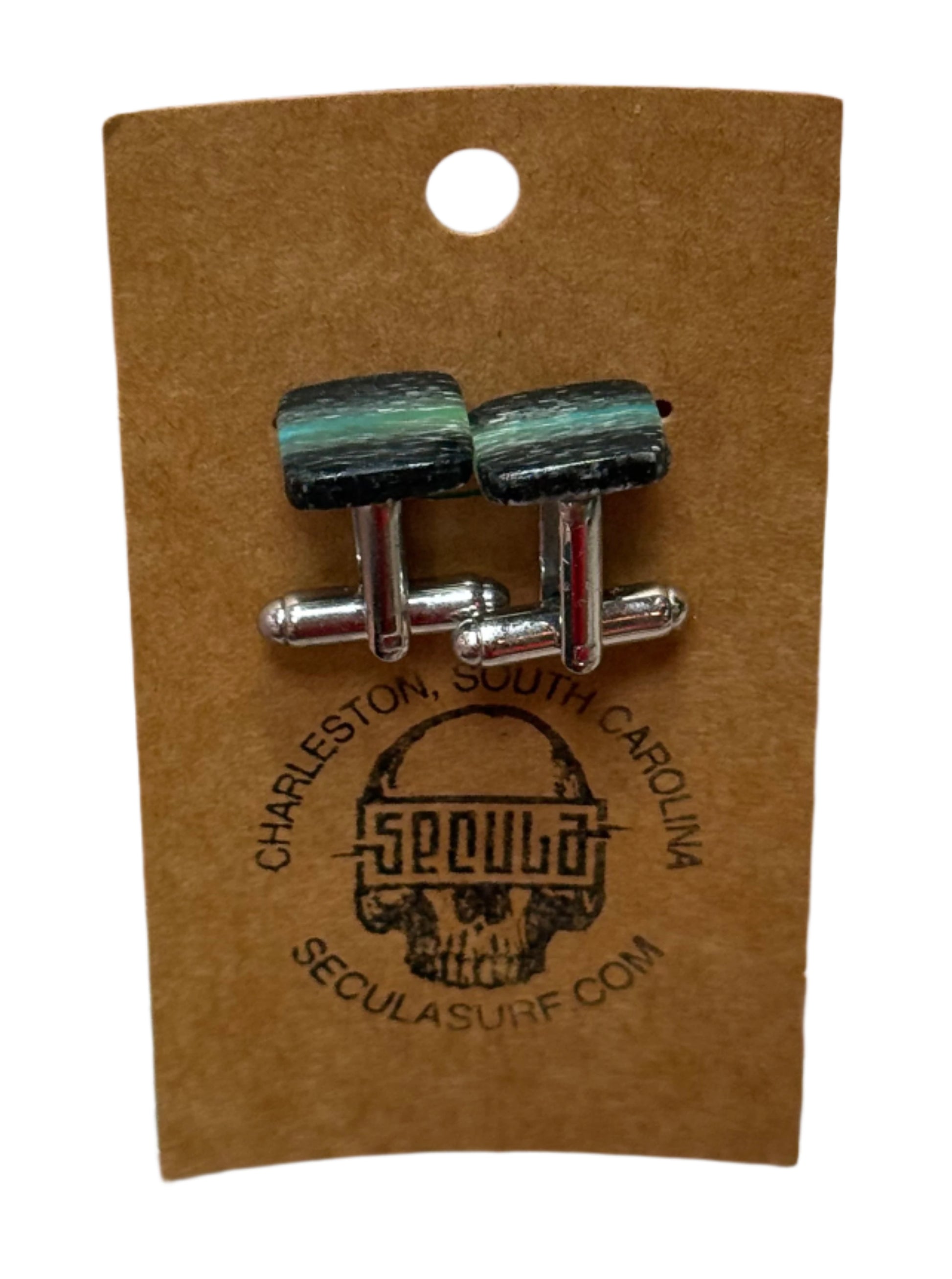 Hand made cufflinks made from upcycled surfboard resin from the surfboard laminating process. They are mounted with epoxy resin onto stainless steel bases. Made from resin from surfboards, each set is unique.