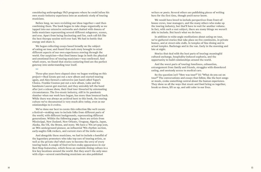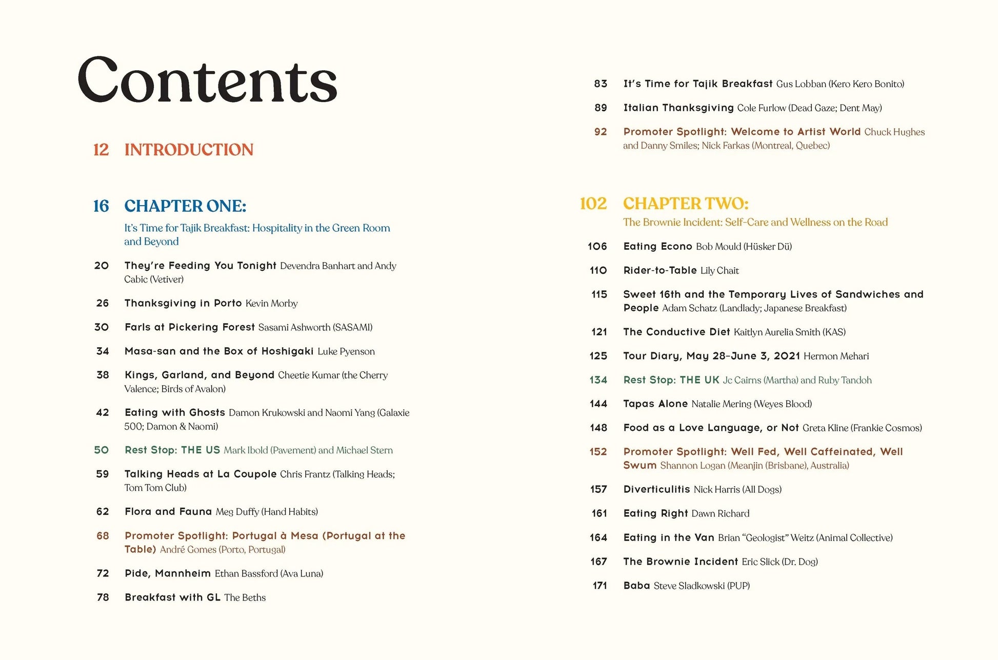 So the question isn’t, “How was tour?” It’s, “What do you eat on tour?” Like the best songs or meals, these conversations and essays evoke something central about the human experience. They show us all the ways that music and food bring us together, break us down, lift us up, and add color to our lives.