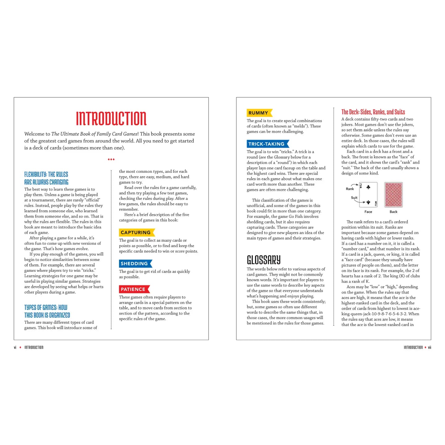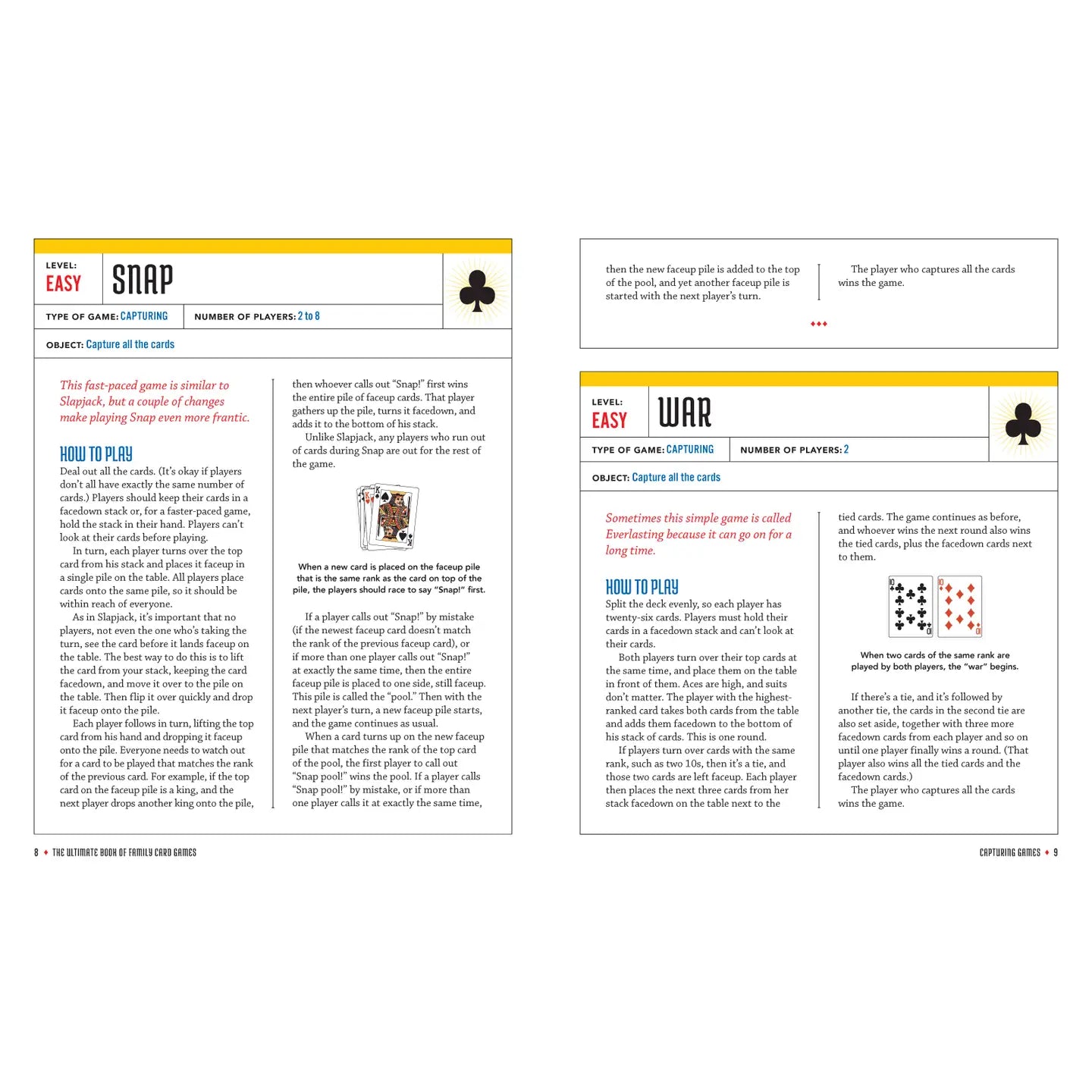 Pick a card game—any card game! Everyone loves to play cards, and this ultimate collection has all the fun favorites (including rummy, spades, war, old maid, go fish, snip snap snorem, and hearts), plus some similar but less widely known games that families will love exploring. There are over 50 games in all, organized by type and difficulty, complete with instructions, rules, strategies, color illustrations, and a brief note on each game's origins. Trade Paperback Book; 8 x 10 inches; 128 pages.