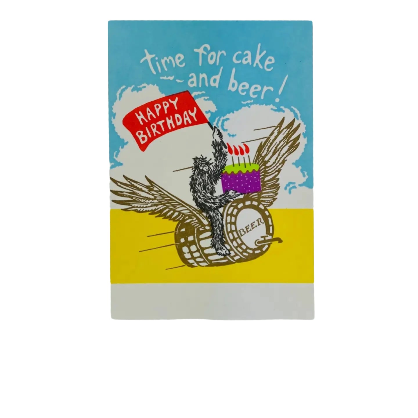 Special delivery. Mini Sasquatch rides a flying barrel of beer. Holding a giant birthday cake. You read that right. Keeping things a little less serious for your favorite birthday goofball. Letterpressed in multiple overlapping colors. Blank inside for your own message. 6 1/4"x4 1/4" card with matching standard A6 square flap envelope.