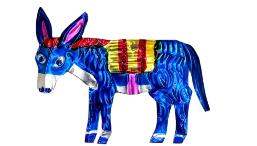Hand painted tin donkey ornament from Oaxaca, Mexico. Painting and color will vary. Painted both sides.