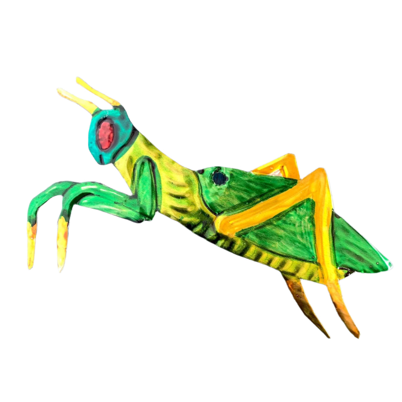 Hand painted tin mantis from Oaxaca. Mexico. Painting may vary.