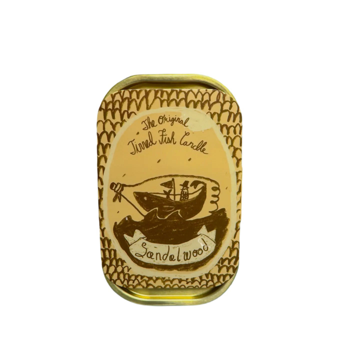 Warm, woodsy, and totally unexpected. This sandalwood-scented candle brings cozy vibes with a bold orange palette inside the tin. The fish? Still in formation. The lid? Still peels just like the real deal. and ships in our new easy-open packaging. Soy Wax Blend. Hand poured, sealed, and packaged.