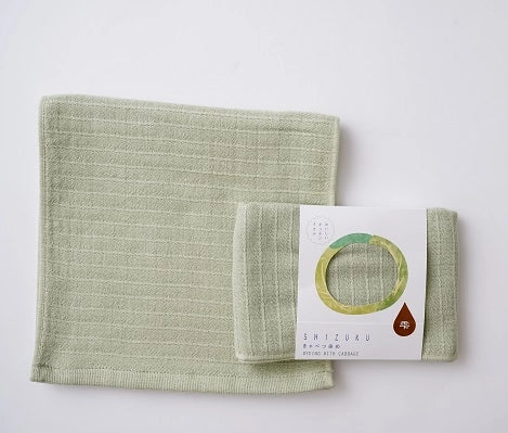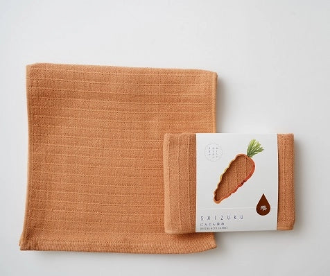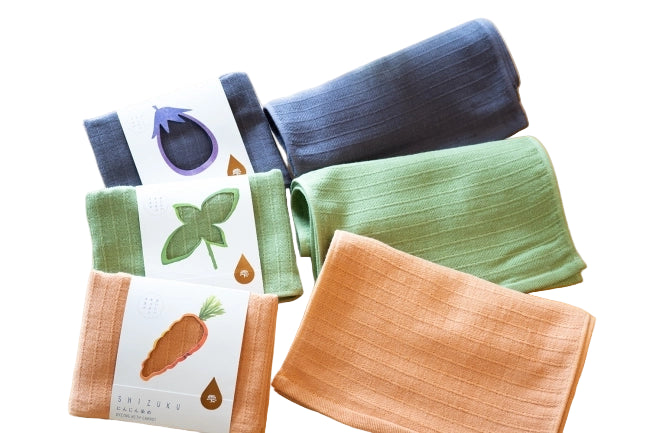 A collaboration of fresh vegetables and towels with excellent water absorbency. The gentle colors dyed with natural dyes add color to your life. Osaka's specialty vegetables such as water eggplant, Senshu onion, cabbage, and carrots. Colors are extracted from discarded fruits, peels, and leaves and made into dyes.