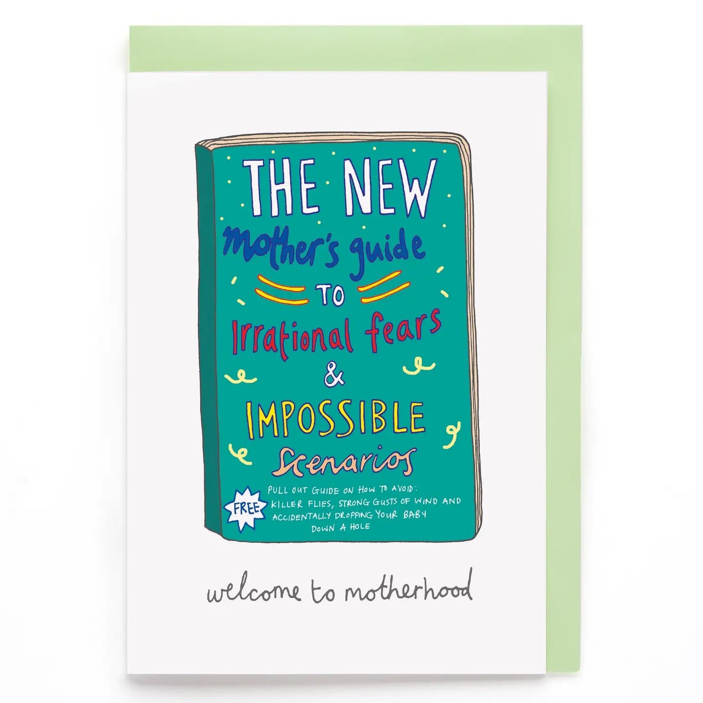 Featuring a playful illustration of a manual titled "The New Mother's Guide to Irrational Fears and Impossible Scenarios," this witty new baby card delivers a humorous take on the ups and downs of motherhood. Hand-drawn with a unique design, it’s the perfect choice for welcoming a new mum who’s just joined the club.